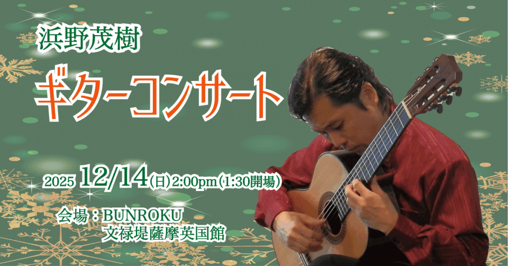 コンサートのご案内ページを公開しました! by shigeki · 公開済み 2025年10月25日 · 更新済み 2025年10月25日 2025年12月14日(日)にコンサートを開催いたします。 年末のお忙しい時期とは思いますが、ギターの音色でホッとしていただけるひとときをお届けしたいと思っておりますので、ぜひご家族お友達お誘い合わせの上、足をお運びください。 詳細とチケットのお申し込みについては下記のリンクでご案内しております。 ≫浜野茂樹 ギターコンサートのお知らせ Share on FacebookTweet共有:投稿いいね:いいね 読み込み中…