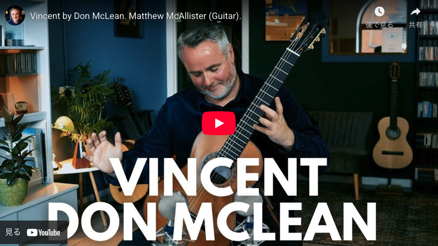 ギター動画を更新しました~M.マカリスターの演奏 by shigeki · 公開済み 2025年10月22日 · 更新済み 2025年10月21日 ブログ『ギター動画』を更新しました。 今日ご紹介するのは、マシュー・マカリスターの動画です。 アメリカのシンガーソングライターであるドン・マクリーンがゴッホへのオマージュとして書いた美しい作品を、暖かな音色で聴かせてくれています。 ゆっくりとお楽しみください。 ≫マシュー・マカリスターが弾くマクリーンの『ヴィンセント』 Share on FacebookTweet共有:投稿いいね:いいね 読み込み中…